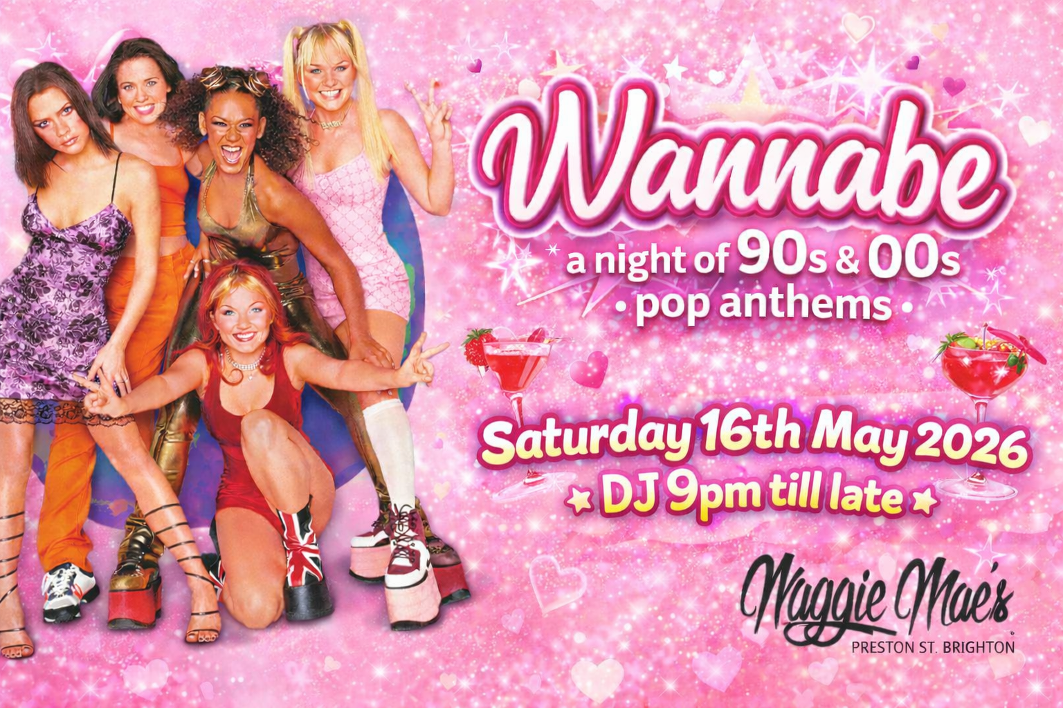 Wannabe – 90s & 00s Pop Night PLEASE NOTE: This is a SEATED TICKET and comes with a table 🎤 Date: Saturday 29th August 2026 🎤 Time: Doors 8.30pm – DJ from