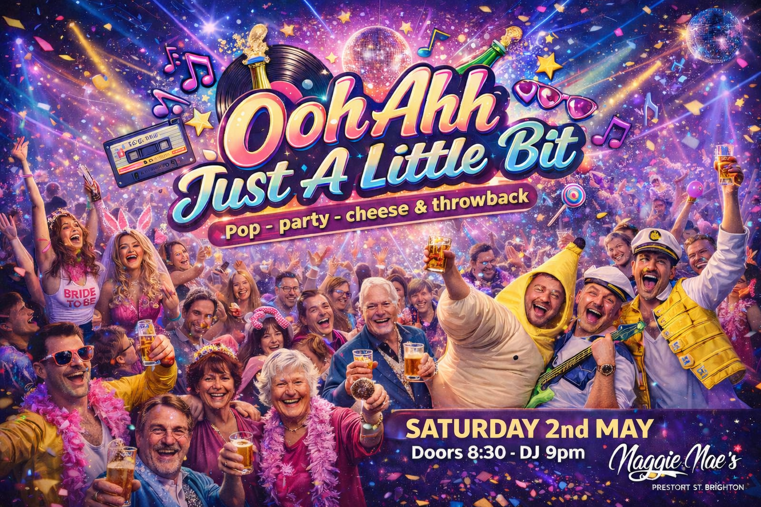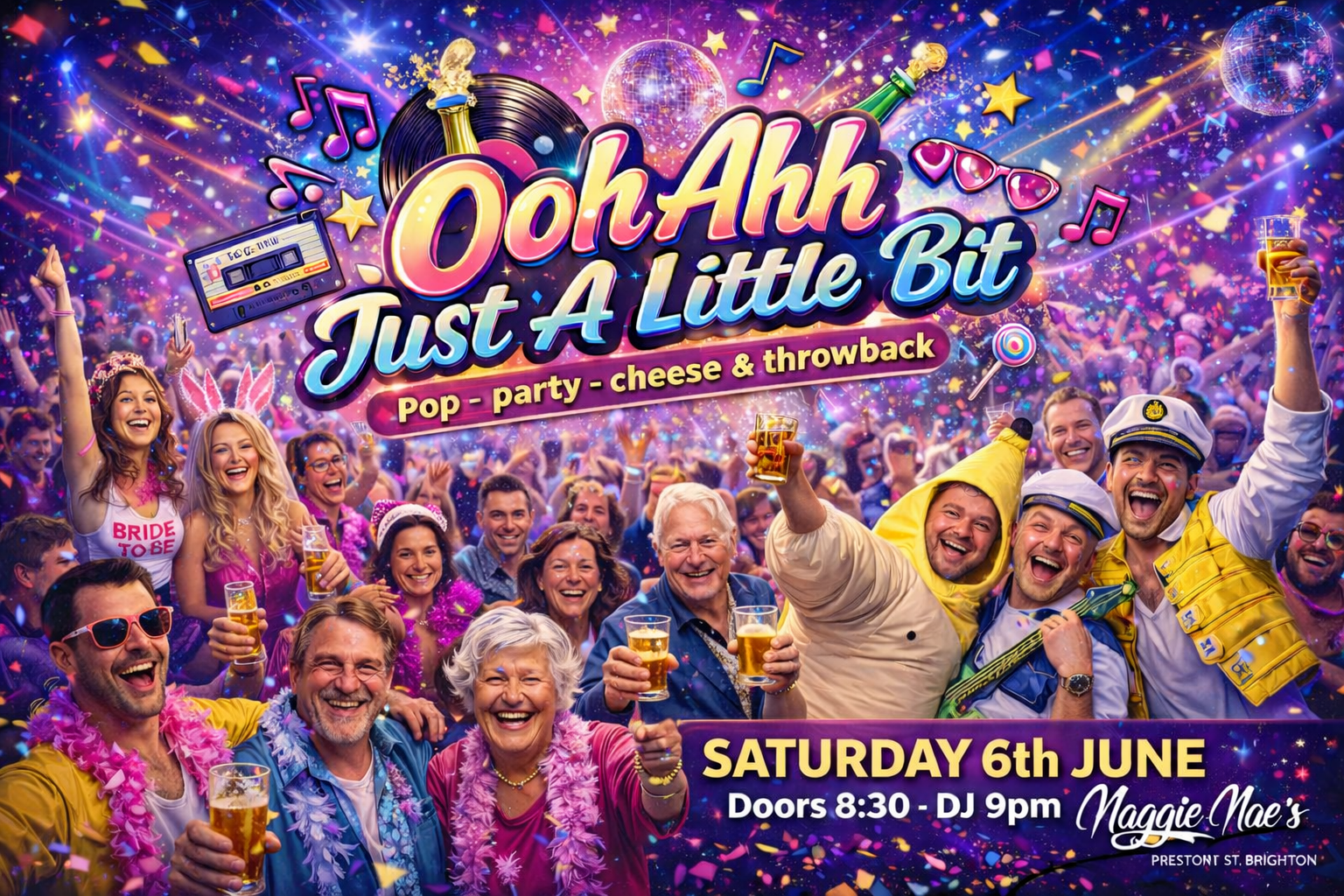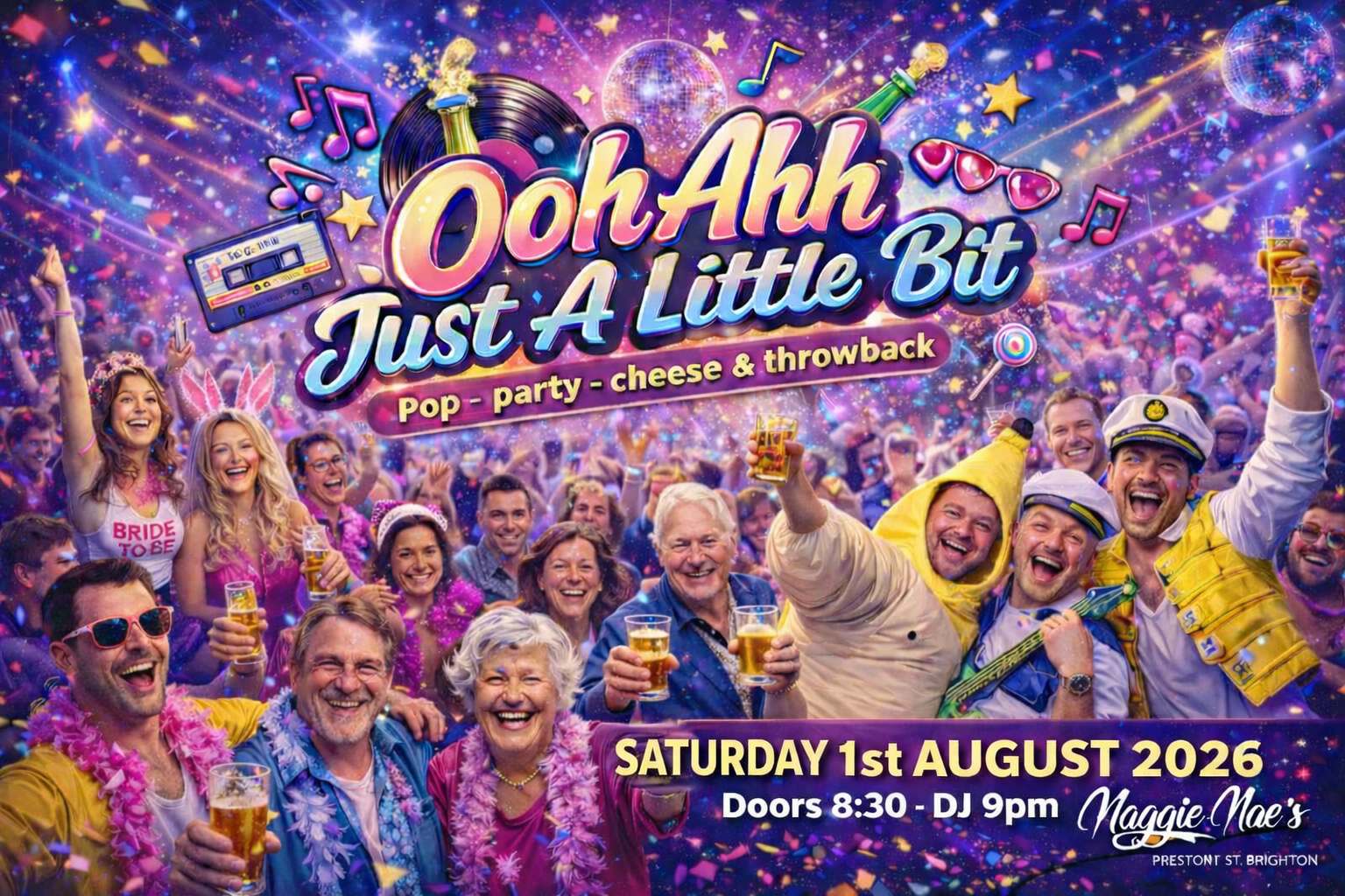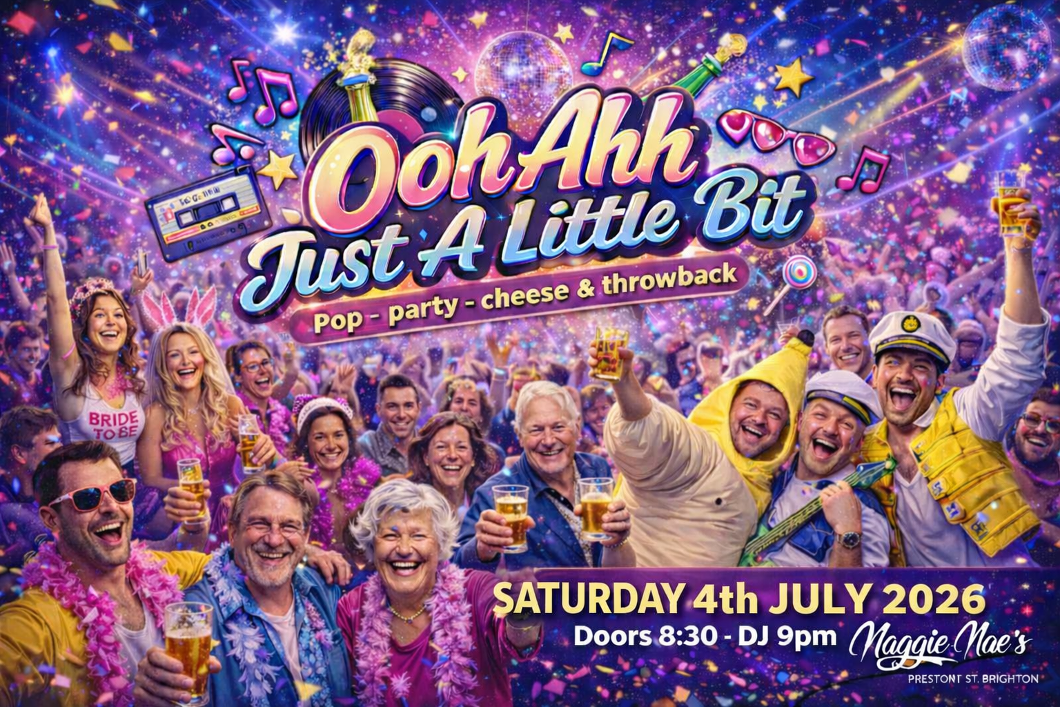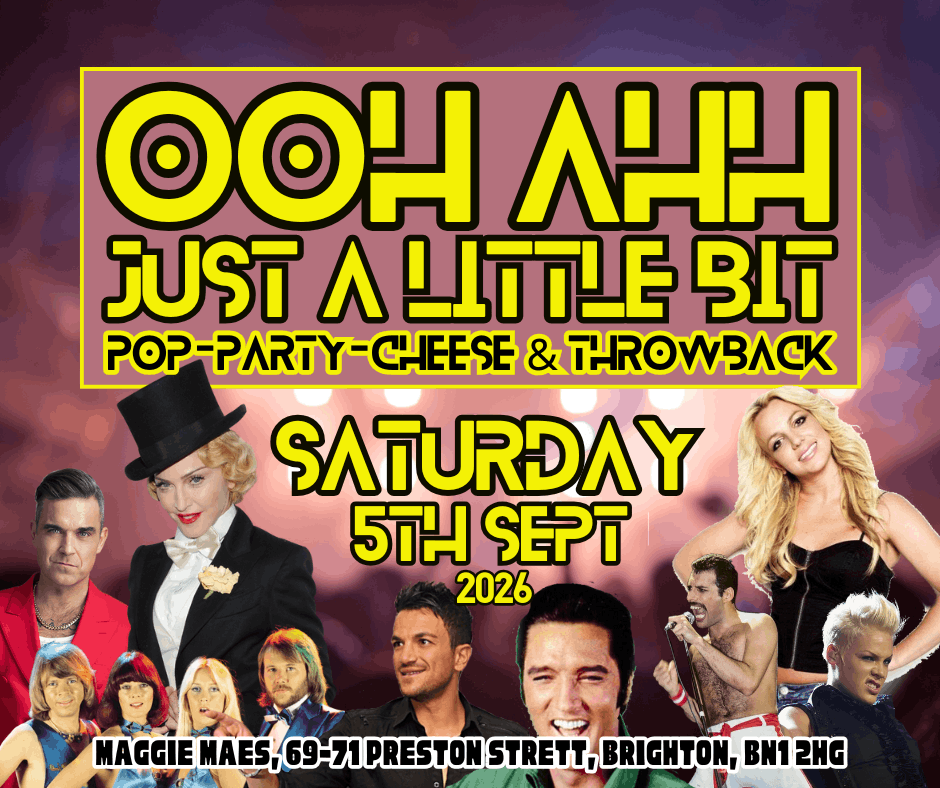 The ‘Ooh Ahh Just a little Bit’ Party is BACK for 2026! Come and join us on Saturday 5th September 2026 at Maggie Maes, Brighton! Expect the usual big party bangers plus some cracking surprises from the 80s, 90s & 00s!