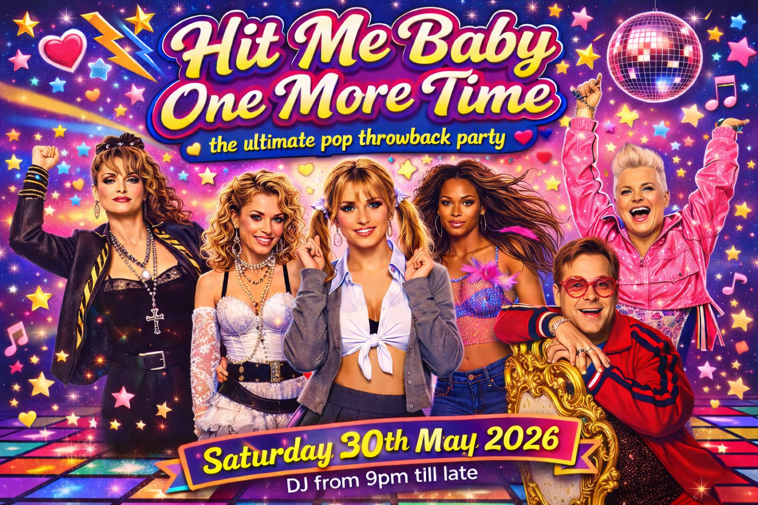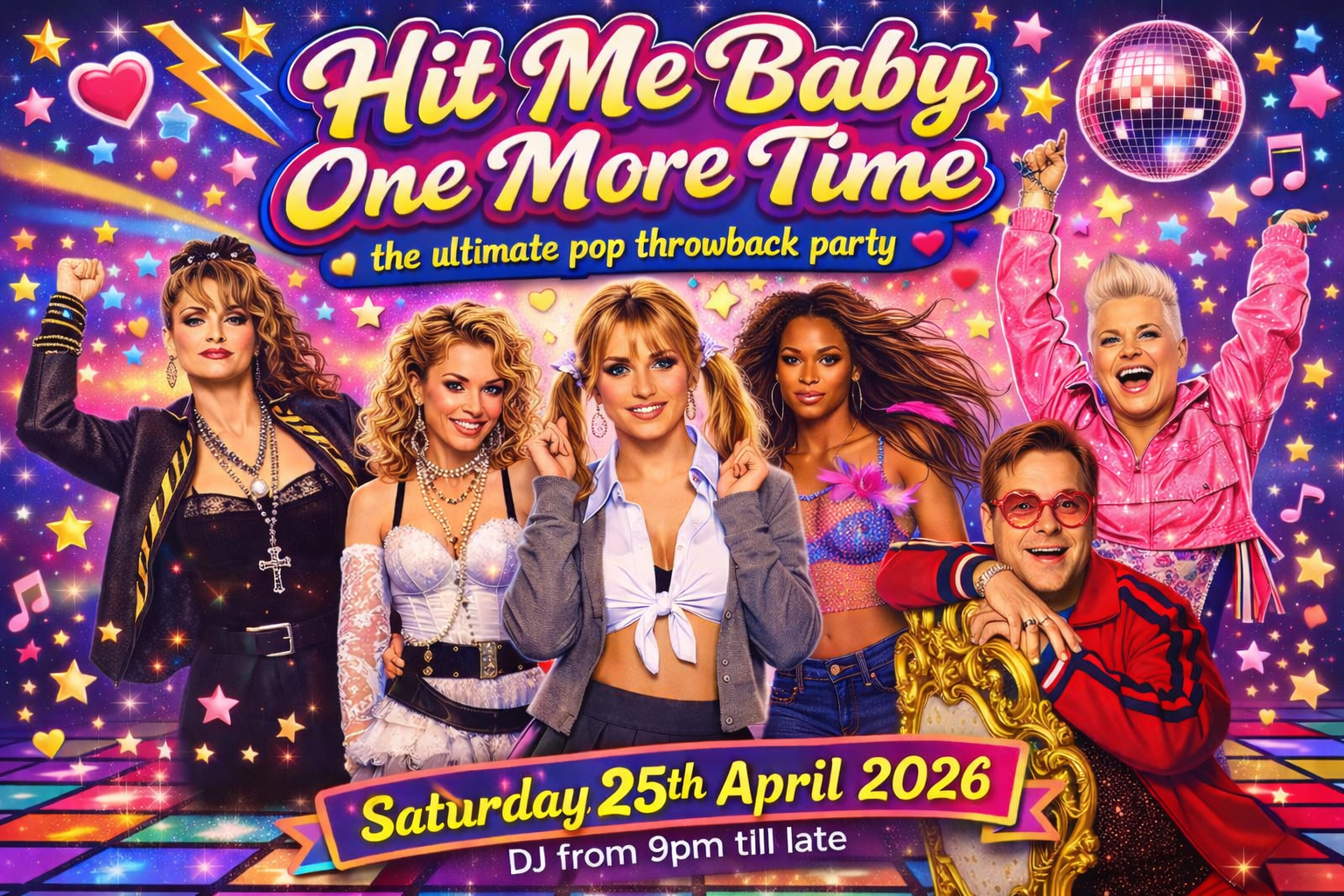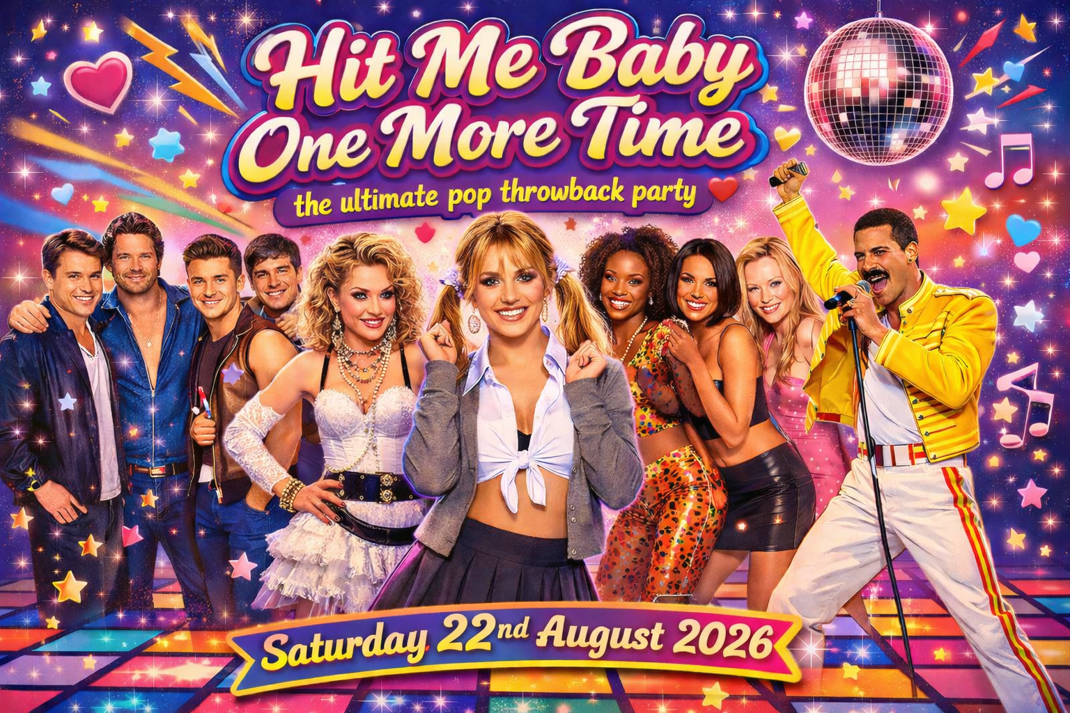 Come and join us on Saturday 26th September 2026 for a night dedicated to the BIGGEST pop and party anthems EVER!! We will be throwing it back to Britney, The Spice Girls, Peter Andre, Grease, Tina Turner, Five, Girls Aloud, Queen, Wham, Pink, Take that and many many more!