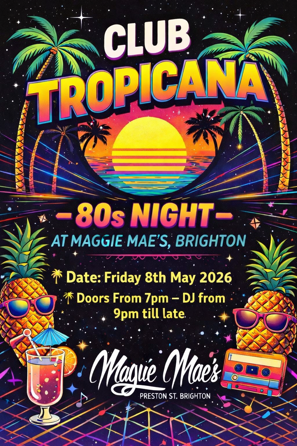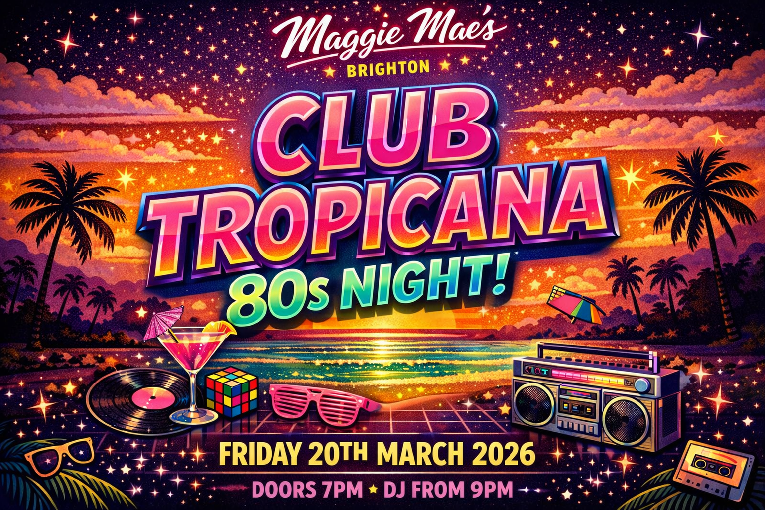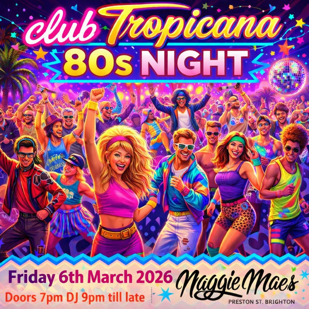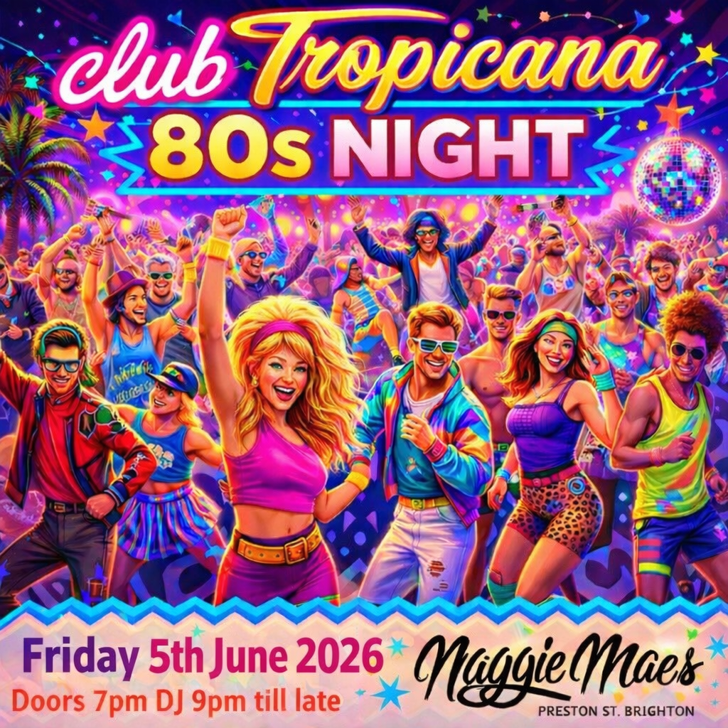 Club Tropicana – 80s Night at Maggie Mae’s, Brighton 🌴 Date: Friday 6th March 2026 🌴 Time: Doors From 7pm – DJ from 9pm till late 🌴 Venue: Maggie Mae’s, Brighton