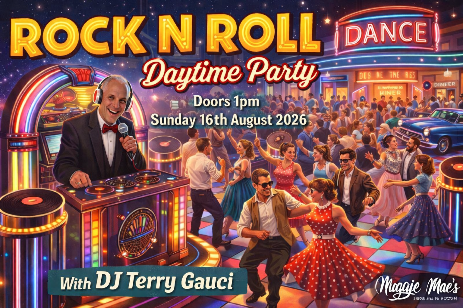Get ready to twist, jive, and rock the afternoon away at our Rock ’N’ Roll Daytime Party at Maggie Mae’s, Brighton on Sunday 16th August 2026! 🎸🕺