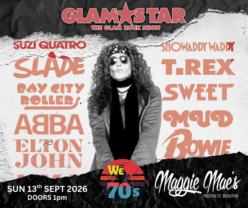Get ready to stomp, clap, and sing along as GlamStar brings the glitter, swagger, and anthems of 70s Glam Rock to Maggie Mae’s, Brighton for a high-energy live afternoon.