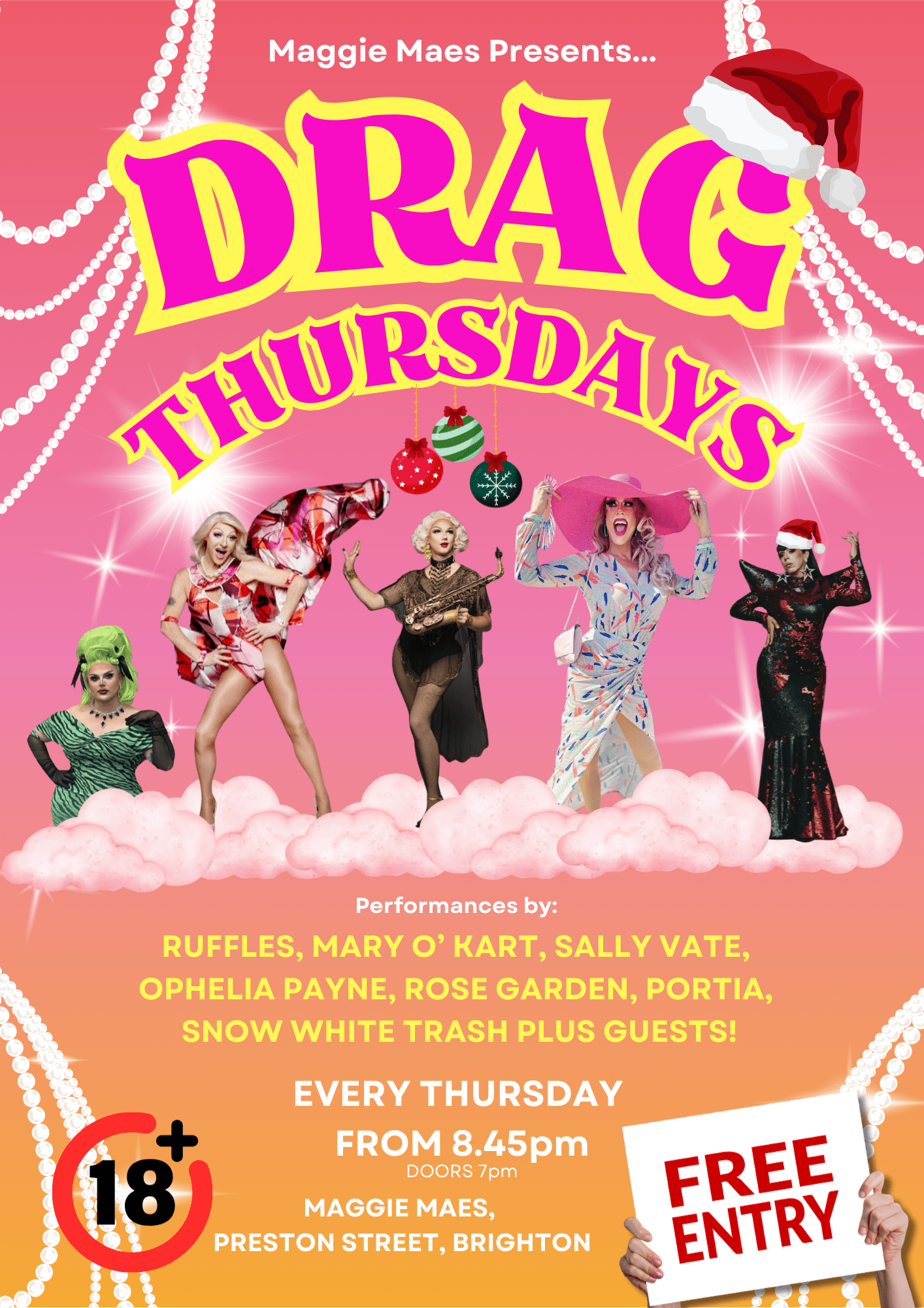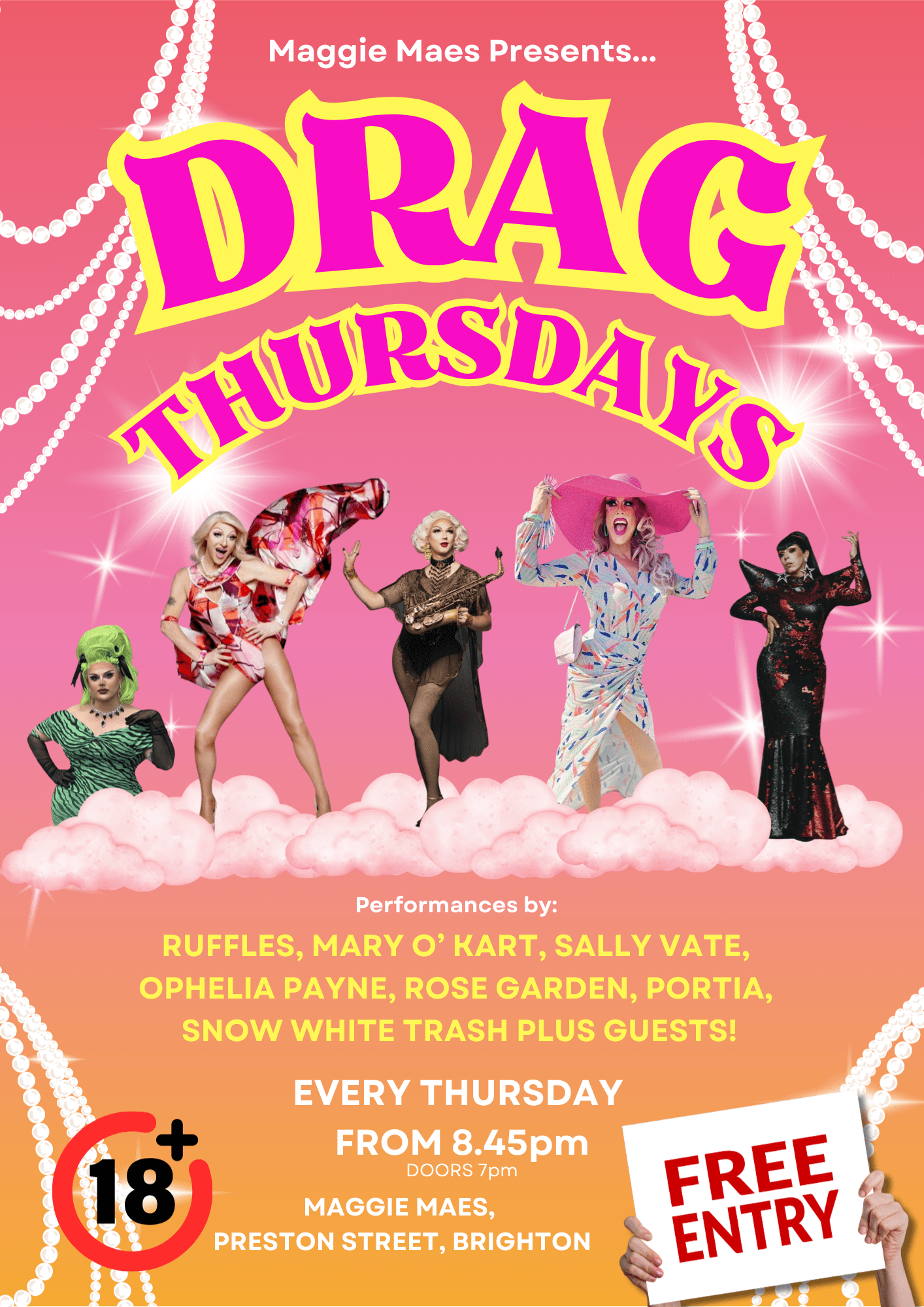 Get ready to slay your Thursday nights at Maggie Maes, Brighton’s home of fabulous fun and fierce performances! Join us every Thursday from 8:30 PM for Drag Thursdays – a dazzling night of outrageous talent, high-energy shows, and unforgettable vibes.