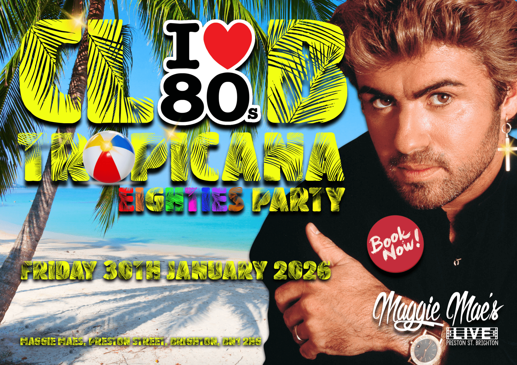 Club Tropicana – 80s Night at Maggie Mae’s, Brighton 🌴 Date: Friday 30th January 2026 🌴 Time: Doors From 7pm – DJ from 9pm till late 🌴 Venue: Maggie Mae’s, Brighton